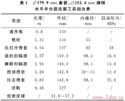 裸眼水平井分段壓裂需要的主要工具類型和參數(shù)見表1。按國際標(biāo)準(zhǔn),投球滑套內(nèi)通徑采用6.3mm梯度,分段級數(shù)小于等于6級,采用3.175mm梯度,分段級數(shù)可達(dá)到10級[1]。