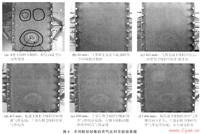 最終的實驗結(jié)果是3個相對高滲砂體中含氣,而周圍的細(xì)砂中含水,尤其值得注意的現(xiàn)象是,在最底部的相對粗砂中雖然充滿了氣,但其中的細(xì)砂仍然含水。