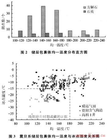 從威遠(yuǎn)、資陽地區(qū)震旦系儲層以方解石為宿主礦物的包裹體均一溫度分布看,均一溫度分布在120~180℃的占絕對優(yōu)勢,同時也檢測到大于180℃的高溫包裹體(圖2)。而從均一溫度與冰點(diǎn)溫度的相關(guān)關(guān)系(圖3)分析,均一溫度分布在120~180℃的包裹體,其冰點(diǎn)溫度有很大的差異,這實(shí)際上反映了兩期烴類的充注,即印支期液態(tài)烴類的充注(低溫高冰點(diǎn))和晚期地層抬升剝蝕過程中氣態(tài)烴類的充注(低溫低冰點(diǎn))。大于180℃的高溫包裹體主要反映了地質(zhì)歷史時期中地層深埋、液態(tài)烴類發(fā)生裂解的燕山期。石英礦物中所檢測到的包裹體數(shù)量雖然不多,但其均一溫度分布范圍大,從102~206℃。
