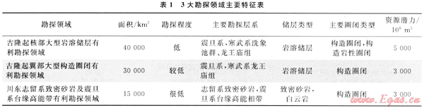 以上分析表明,四川盆地震旦系-下古生界具有有利的油氣成藏條件,資源潛力大,但勘探程度仍然很低,勘探前景廣闊。從勘探程度及研究、認(rèn)識程度綜合分析,主要有3大勘探領(lǐng)域,即古隆起核部大型巖溶風(fēng)化殼勘探領(lǐng)域、古隆起翼部大型構(gòu)造圈閉勘探領(lǐng)域和川東志留系致密砂巖及震旦系臺緣高能帶勘探領(lǐng)域,各領(lǐng)域的主要特征見表1。