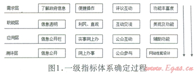 當(dāng)前主要電子政務(wù)網(wǎng)站績效評估指標(biāo)缺乏明確的來源說明。本文從層次演化關(guān)系,提出了一種從需求層向職能層、應(yīng)用層、測評層逐層演化的方式,確定主要績效指標(biāo)體系,如下圖l.所示: