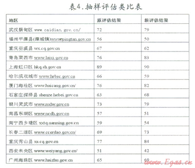 利用新權(quán)重,我們針對部分隨即抽樣區(qū)縣進(jìn)行重新評估。根據(jù)第一部分所提出的評分公式:P=a[∑bi(∑mij·cij)];N∑Pn,在各地各項三級指標(biāo)得分一致的前提下,計算出原有體系和新權(quán)重體系下的得分,將得到的結(jié)果與原來的結(jié)果進(jìn)行類比分析,如下表4所示: