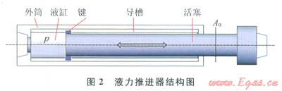 液力推進(jìn)器連接在下部鉆具內(nèi)。它是一個(gè)液缸活塞短節(jié)。圖2為液力推進(jìn)器結(jié)構(gòu)岡例。依靠液缸內(nèi)的液體壓力推動(dòng)活塞運(yùn)動(dòng),實(shí)現(xiàn)給鉆頭加壓。依靠外筒上的導(dǎo)槽與活塞端部的鍵來(lái)傳遞扭矩。
