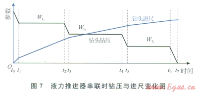 4)可以通過(guò)多個(gè)液力推進(jìn)器的串聯(lián),實(shí)現(xiàn)增加推進(jìn)行程和多鉆壓或選鉆壓鉆進(jìn)。圖7為3個(gè)液力推進(jìn)器串聯(lián)使用的鉆壓和進(jìn)尺變化圖。在當(dāng)前鉆井液排量、鉆頭噴嘴組合和下部鉆具組合的條件下,3個(gè)推進(jìn)器的工作鉆壓分別為Wt1、Wt2和Wt3。當(dāng)在t0時(shí)刻將鉆壓加滿額時(shí),3個(gè)推進(jìn)器都處在全縮進(jìn)狀態(tài),依靠鉆柱彈性鉆進(jìn)至t1時(shí)刻;在t1至t2時(shí)刻,第1個(gè)推進(jìn)器處于工作狀態(tài),其余2個(gè)處于全縮進(jìn)狀態(tài);在t3至t4時(shí)刻,第l個(gè)推進(jìn)器處于全伸出狀態(tài),其余2個(gè)處于全縮進(jìn)狀態(tài),依靠鉆柱彈性鉆進(jìn);在t3至t4時(shí)刻,第1個(gè)推進(jìn)器處于全伸出狀態(tài),第2個(gè)推進(jìn)器處于工作狀態(tài),第3個(gè)處于全縮進(jìn)狀態(tài);在t4至t5時(shí)刻,第l個(gè)和第2個(gè)推進(jìn)器處于全伸出狀態(tài),第3個(gè)處于全縮進(jìn)狀態(tài),依靠鉆柱彈性鉆進(jìn);在t5至t6時(shí)刻,第l個(gè)和第2個(gè)推進(jìn)器處于全伸出狀態(tài),第3個(gè)推進(jìn)器處于工作狀態(tài);在t6至t7時(shí)刻,3個(gè)推進(jìn)器都處于全伸出狀態(tài),依靠鉆柱彈性鉆進(jìn),直至鉆壓為零。在多個(gè)液力推進(jìn)器串聯(lián)時(shí),可以像圖7那樣讓所有的推進(jìn)器全部工作,也可以通過(guò)控制地面送鉆使其中的部分推進(jìn)器工作,不工作的推進(jìn)器處于全伸出狀態(tài)或全縮進(jìn)狀態(tài)。