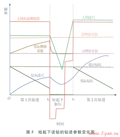 如何克服地面單向送鉆因摩擦力不確定帶來(lái)的鉆壓不確定的問(wèn)題?用短起下送鉆方法(圖5),在鉆頭鉆壓較小時(shí)就上提鉆柱,將靜摩擦力克服掉,上提一段后,下放鉆柱,重新按照鉆壓控制參考表施加。這樣就可以減小施加到鉆頭上的鉆壓的誤差。