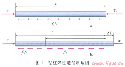 對(duì)于沒(méi)有加液力推進(jìn)器或水力振蕩器的帶有井下動(dòng)力的鉆具組合,在送到井底并加上鉆壓后,地面就暫停送鉆。此時(shí),從地面看,鉆桿已經(jīng)停止運(yùn)動(dòng),那么鉆頭是否也已經(jīng)停止鉆進(jìn)?顯然不是,那么是什么在推動(dòng)鉆頭前進(jìn)?答案是鉆柱的彈性。鉆柱彈性送鉆原理如圖l所示。