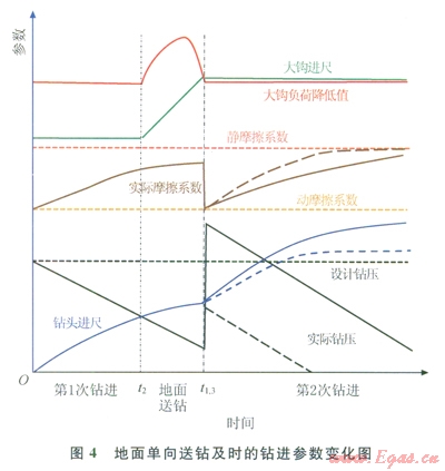 地面單向送鉆是指在鉆進(jìn)過(guò)程中沒(méi)有上提鉆具操作,只有下放鉆具和停止的送鉆方式。