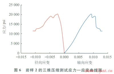 三維壓縮實(shí)驗(yàn)應(yīng)力 應(yīng)變曲線如圖5、6所示。巖石材料的塑性與脆性可根據(jù)應(yīng)力、應(yīng)變曲線上負(fù)坡的坡降大小來(lái)劃分。負(fù)坡較陡者為脆性,反之為塑性。由圖5、6可知:巖樣1和巖樣2在應(yīng)力分別為l2000psi(1psi=6.895kPa)和20000psi時(shí),應(yīng)變?yōu)?span lang="EN-US">0.01、0.009時(shí)破碎,屬于脆性巖石,且?guī)r樣2應(yīng)力、應(yīng)變曲線上的負(fù)坡較陡,故其脆性優(yōu)于巖樣1。
