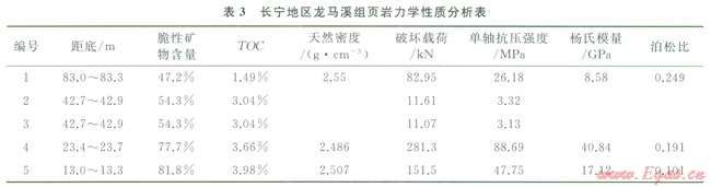 不同沉積亞相類型的頁巖中礦物組成結(jié)構(gòu)不同。龍馬溪組底部的深水陸棚相頁巖較其他層位的頁巖具有更高的脆性礦物含量。頁巖中石英的來源除了是細粒低變質(zhì)巖、風(fēng)化作用中粗顆粒的破碎、搬運過程中的磨蝕以及黏土成巖過程中的石英之外,還包括生物成因蛋白石的重結(jié)晶[23]形成的生物成因石英礦物。龍馬溪組底部的頁巖主要來自于深水陸棚相沉積,深水陸棚相沉積中富含大量生物,含硅質(zhì)(如硅藻、放射蟲、海綿骨針等)及碳酸鹽礦物的(如有孔蟲和超微化石等)生物的富集提供了生物成因的脆性礦物,因此含有更高的脆性礦物。龍馬溪組頁巖有機質(zhì)越高,脆性礦物含量越高,具有較高的楊氏模量和較低的泊松比(表3),表明巖石脆性越好[13],越容易形成天然裂縫和人工誘導(dǎo)縫,可以有效改善儲層物性及提高壓裂的成功率。根據(jù)美國頁巖氣開采經(jīng)驗,產(chǎn)氣層段主要是硅質(zhì)或鈣質(zhì)含量較高的細粒巖層,純泥巖或頁巖段幾乎不產(chǎn)氣,頁巖產(chǎn)氣率隨著脆性礦物含量的增加而增加。壓裂梯度與頁巖中的黏土、石英和碳酸鹽巖含量有關(guān)[24]。在人工壓裂中富含硅質(zhì)的頁巖要比富含黏土質(zhì)頁巖更容易被壓裂[25]。