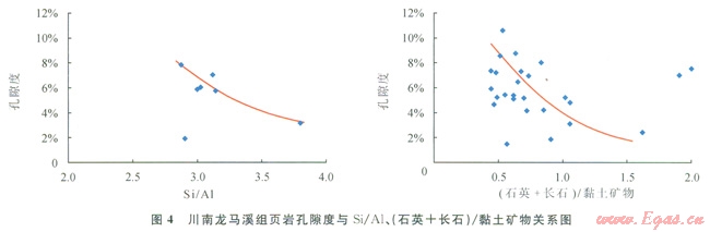 龍馬溪組頁巖Si/Al高的總孔隙體積相對較低,隨著硅酸鋁含量的增加,Si/Al降低,孔隙度增加(圖4)。黏土礦物含量與頁巖孔隙度呈正相關(guān)[21],富含黏土礦物(低Si/Al比)的頁巖要比富含硅質(zhì)(高Si/Al比)的頁巖總孔隙度大,這與黏土礦物中鋁硅酸鹽的開放孔隙有關(guān)。根據(jù)前人研究結(jié)果,富含黏土礦物(低Si/Al比)的頁巖孔隙直徑小于10nm,呈單峰分布,總孔隙度為5.6%,而富含硅質(zhì)(高Si/Al比)頁巖無微孔和中孔,總孔隙度為1%[22]。