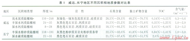 頁巖沉積物源及沉積相的差異,造成在區(qū)域上礦物組成的差異較大。長寧地區(qū)的深水陸棚相脆性礦物含量相對威遠地區(qū)高一些,平均在75.9%~84.3%,其中石英含量介于21.7%~37.4%,含氣量相對較高,主要分布在2.6~6.5m3/t。而威遠地區(qū)的深水陸棚相頁巖脆性礦物含量為21.3%~66.6%,石英含量介于18.1%~66.2%,含氣量為2.3~3.2m3/t。半深水陸棚相頁巖的礦物組成含量規(guī)律與深水陸棚相基本相同,長寧地區(qū)半深水陸棚頁巖的脆性礦物含量要比威遠地區(qū)略高,平均在37.4%~58.2%,其中石英含量介于22.5%~32.0%,具有較高的含氣性,含氣量介于1.0~3.0m3/t。而威遠地區(qū)的深水陸棚相頁巖脆性礦物含量在18.1%~31.2%,石英含量介于l0.5%~25.2%,含氣量介于1.0~2.9m3/t,含氣性與長寧地區(qū)大致相當(dāng)。淺水陸棚相只發(fā)育在威遠地區(qū),長寧地區(qū)缺失。威遠地區(qū)的淺水陸棚主要為泥質(zhì)沉積物源,泥質(zhì)含量極高,脆性礦物含量較少,僅有29.3%~31.8%,其中石英含量為28.5%~29.3%。