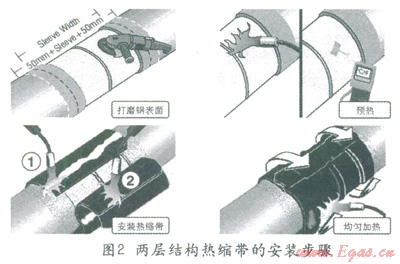 兩層結(jié)構(gòu)熱縮帶施工簡(jiǎn)單,只需要對(duì)海管節(jié)點(diǎn)裸鋼表面進(jìn)行打磨、預(yù)熱就可以安裝熱縮帶了。安裝過(guò)程只需要將熱縮帶纏繞在節(jié)點(diǎn)上,按要求均勻加熱,熱縮帶就會(huì)收縮,緊緊的固定在節(jié)點(diǎn)鋼表面上。一般只需要占用鋪管作業(yè)線的一個(gè)站點(diǎn),兩個(gè)人用五分鐘左右就可以完成一個(gè)節(jié)點(diǎn)的防腐施工。