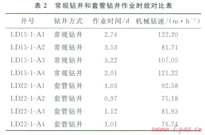 樂東22-1氣田套管鉆井技術的應用取得了良好的應用效果。樂東22-1-A2Æ339.7mm套管鉆進至井深314.97m,總進尺l80.44m,平均機械鉆速75.18mh;與未使用套管鉆井的鄰井相比,作業(yè)時效有較大幅度的提高。表2為南海西部樂東氣田幾口常規(guī)井和套管鉆井的表層作業(yè)時間的對比。