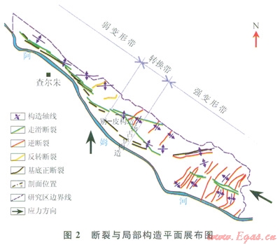 東部強變形帶指基薩爾褶皺隆起區(qū)和別什肯特坳陷,構造以逆掩斷裂背斜構造帶為主?;_爾褶皺隆起區(qū)構造變形強度最大,逆掩斷裂發(fā)育(圖2),愈靠近強烈活動的斷層,褶皺變形越明娩,并且臨近逆沖斷層—翼陡傾不對稱。逆沖斷裂平面呈北東走向的“S”形,另有一組北西西向走滑斷裂,切割北西走向的逆沖斷裂構造帶。別什肯特坳陷逆掩斷裂背斜帶呈狹長線形,走向北東,控制構造的主控斷層斷距和構造幅度較基薩爾褶皺隆起區(qū)小。