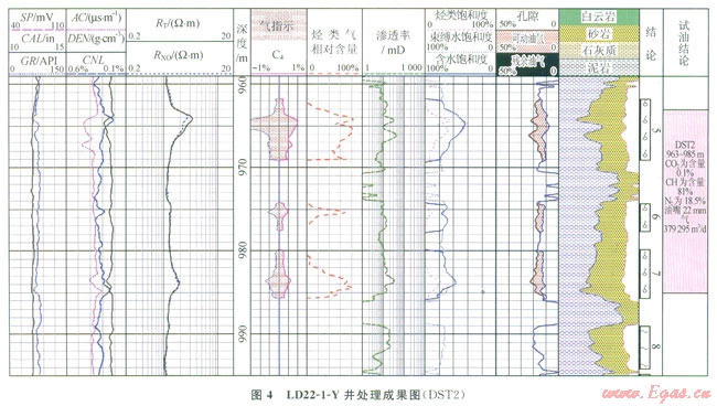 圖4顯示LD22-1-Y井963~985m段測井定量計算烴類氣含量為75%左右,測試證實(shí)該層甲烷含量為81%。通過鶯歌海盆地l5口井19個層位測井計算烴類氣含量與實(shí)測結(jié)果對比,在統(tǒng)計的l9層中,絕對誤差在20%以內(nèi)的層有l5層,占79%;絕對誤差在10%以內(nèi)的層有l2層,占63%[13]。表明該定量方法能較為有效地計算烴類氣含量,從而達(dá)到區(qū)分烴類氣與非烴氣的目的。