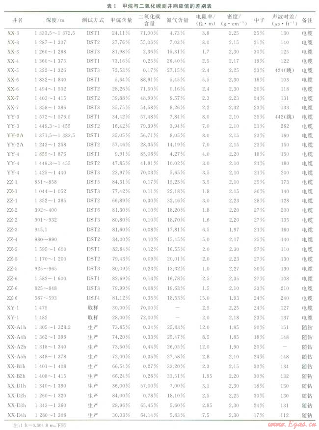 烴類氣與二氧化碳?xì)鈱釉跍y井曲線上的響應(yīng)特征與油、水層有較明顯的區(qū)別,而它們兩者之間的差異卻較小,這是造成用測井資料區(qū)分甲烷和二氧化碳困難的根本原因。但通過對二者理論上測井響應(yīng)值的研究可知,兩者還是存在一定的差別,因而兩種氣體在測井曲線上必定存在或多或少的差異,這是用測井資料定性、定量區(qū)分烴類氣與二氧化碳?xì)獾幕A(chǔ)[4]。