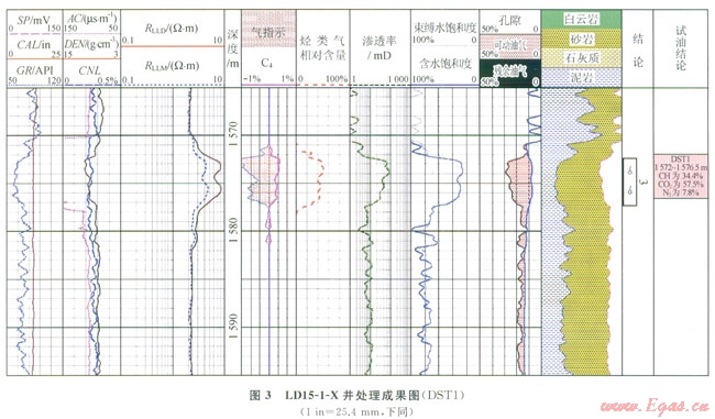圖3顯示LDl5-1-X井1572~1577m段第2道中子密度出現(xiàn)交會,第3道電阻率增大,第5道孔隙度差、比值識別法出現(xiàn)明顯的氣層“包絡(luò)”特征,第8道測井計算的含水飽和度與束縛水飽和度幾乎重合,含水飽和度大致為30%,第6道為該方法定量計算出的烴類氣相對含量,大概在40%左右,DST測試證實(shí)該層甲烷含量為34.4%,測試的結(jié)果與定量計算的結(jié)果相近。