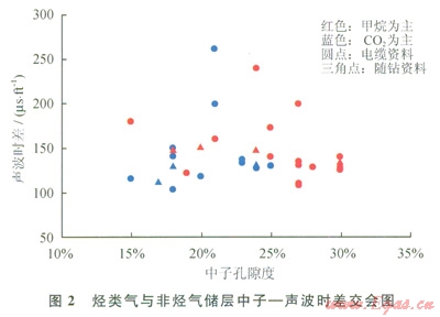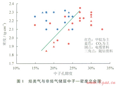 根據(jù)上述分析,采用交會圖技術(shù)研究了兩者在測井響應(yīng)上的差別。在樂東l5-1/22-1研究區(qū)選取了經(jīng)測試、電纜測試取樣或試生產(chǎn)證實(shí)含量相對比較高的甲烷或二氧化碳層段(表1),并定義甲烷含量高于50%的氣層為以甲烷為主的氣層,否則為以非烴為主(CO2為主)的氣層,然后利用這些層段的測井資料分別作出了密度一中子、密度一聲波交會圖(圖1、2)。從圖l、2中可以看出:烴類氣與二氧化碳?xì)怏w在測井響應(yīng)值上是存在一定差別的,從而可以通過這種差異來區(qū)分烴類氣與二氧化碳?xì)鈱?sup>[10]。