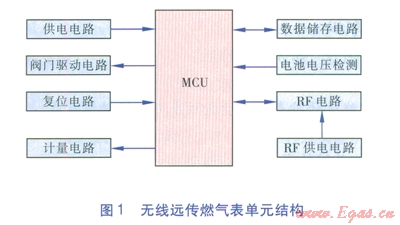 無(wú)線遠(yuǎn)傳燃?xì)獗碛杀砭摺?span lang="EN-US">MCU(Micro Controller Unit,微控制單元)、通信模塊(RF電路)、計(jì)數(shù)采樣裝置、控制機(jī)構(gòu)等單元組成。其中,MCU采用l6位單片機(jī),該單片機(jī)具有功耗低、運(yùn)算速度快、可在線編程等優(yōu)點(diǎn)。通信模塊采用3種工作頻率(433、868、915MHz,分別為中國(guó)、歐洲國(guó)家、美國(guó)采用的工作頻率)RF電路,采用GFSK(Gauss Frequency Shift Keying,高斯頻移鍵控)調(diào)制模式,具有極好的頻率穩(wěn)定性和較高的接收靈敏度,符合國(guó)家無(wú)線電管理委員會(huì)的相關(guān)規(guī)定。無(wú)線遠(yuǎn)傳燃?xì)獗韱卧Y(jié)構(gòu)見(jiàn)圖l。