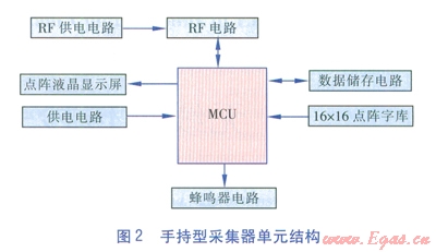 手持型采集器中MCU、供電電路、RF供電電路、RF電路、數(shù)據(jù)儲(chǔ)存電路的功能與無(wú)線遠(yuǎn)傳燃?xì)獗碇懈鲉卧墓δ芤恢?。其他單元的功能為:點(diǎn)陣液晶顯示屏:負(fù)責(zé)顯示手持型采集器的工作信息及計(jì)量數(shù)據(jù);16×16點(diǎn)陣字庫(kù):作為點(diǎn)陣液晶顯示屏的字庫(kù);蜂嗚器電路:為手持型采集器蜂鳴器提供電力,保證蜂嗚器正常工作。