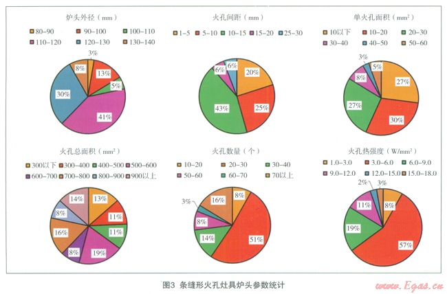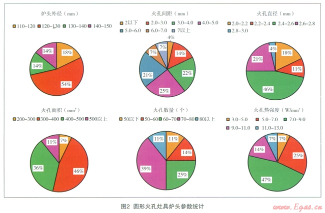 本文通過對(duì)65臺(tái)目前中國燃具市場(chǎng)上常見的民用大氣式燃?xì)庠罹郀t頭進(jìn)行調(diào)研,著重統(tǒng)計(jì)分析了目前中國灶具廠商出廠的各類灶具爐頭的不同火孔類型、火孔尺寸、火孔間距、火孔數(shù)量、火孔熱強(qiáng)度以及灶具額定熱負(fù)荷等數(shù)據(jù),并對(duì)部分樣本灶具進(jìn)行不同氣質(zhì)情況下的熱效率和CO排放性能分析,以驗(yàn)證不同爐頭設(shè)計(jì)對(duì)氣源氣質(zhì)變化的適應(yīng)能力。