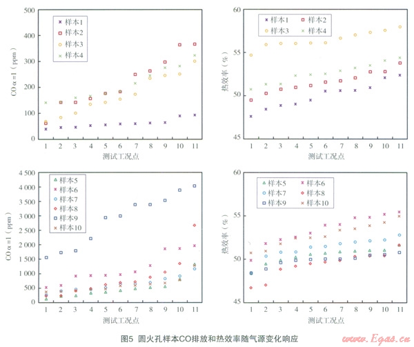 對(duì)10臺(tái)圓形火孔樣本的CO排放和熱效率性能在11種氣源情況下的響應(yīng)分析列于圖5。其中,樣本1~4所有測(cè)試工況下的CO排放響應(yīng)值均在國標(biāo)要求的500×10-6以下,且除樣本l的5個(gè)測(cè)試工況外,其他所有測(cè)試工況點(diǎn)的熱效率響應(yīng)均在國標(biāo)規(guī)定的50%以上。說明這4臺(tái)樣本的適應(yīng)能力較強(qiáng),能較好的應(yīng)對(duì)氣源氣質(zhì)變化。統(tǒng)計(jì)4臺(tái)樣本的爐頭設(shè)計(jì)發(fā)現(xiàn),設(shè)計(jì)火孔熱強(qiáng)度為7.2W/mm2 ~8.4W/mm2,爐頭外徑選擇在125mm~135mm內(nèi),設(shè)計(jì)火孔總面積為350mm2~430mm2,e值分布在30~40之間。樣本5~10的CO排放響應(yīng)表現(xiàn)并不理想,其中樣本6和9所有測(cè)試工況CO排放均在500×10-6以上,其他4臺(tái)樣本過半數(shù)測(cè)試工況點(diǎn)CO排放超標(biāo);熱效率響應(yīng)方面除樣本8和9外,其他4臺(tái)樣本表現(xiàn)尚屬理想;但若同時(shí)考慮CO排放和熱效率,則發(fā)現(xiàn)樣本5~10的沒計(jì),均是在保證熱效率達(dá)標(biāo)的前提下犧牲了CO排放,實(shí)際應(yīng)用中不建議采用這類“高效率高排放”的燃?xì)庠?。統(tǒng)計(jì)6臺(tái)樣本的爐頭設(shè)計(jì)發(fā)現(xiàn),其中5臺(tái)樣本的設(shè)計(jì)火孔熱強(qiáng)度均大于llW/mm2,最大達(dá)到了l5.2W/mm2,爐頭外徑則集中在l20mm~130mm和l40mm~150mm兩個(gè)范圍,設(shè)計(jì)火孔總面積為260mm2~300mm2,e值整體較大分布在40~65之間。故,如圖4所示高火孔熱強(qiáng)度易出現(xiàn)CO排放問題;爐頭直徑過大則會(huì)導(dǎo)致中心火焰二次空氣供給變差,燃燒效率降低,污染物排放不理想;e值選擇過大,則反映出爐頭火孔分布不合理,火孔過于分散,火焰較硬,傳熱效果變差影響熱效率。