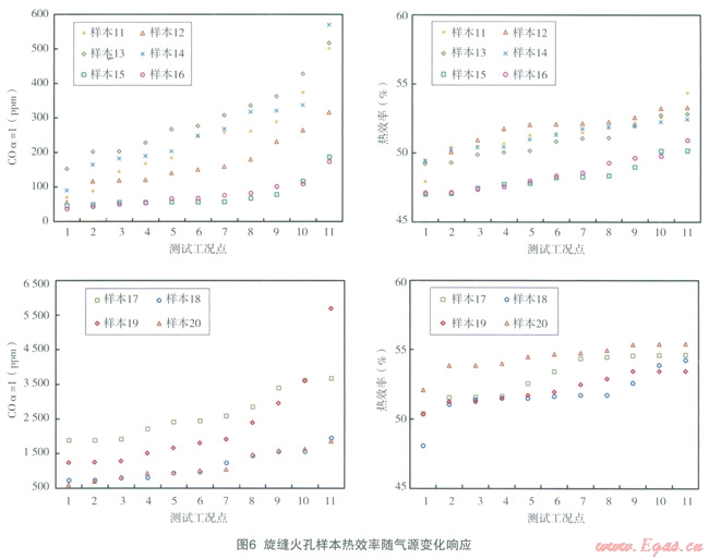 對(duì)10臺(tái)旋縫火孔樣本的CO排放和熱效率性能在11種氣源情況下的響應(yīng)分析列于圖6。其中,樣本11~16基本所有測(cè)試工況下的CO排放響應(yīng)值均在國標(biāo)要求的500×10-6以下,且除樣本l5和16外,其他4臺(tái)樣本的熱效率響應(yīng)基本均在國標(biāo)規(guī)定的50%以上。說明樣本ll~14這4臺(tái)樣本的適應(yīng)能力較強(qiáng),能較好的應(yīng)對(duì)氣源氣質(zhì)變化,統(tǒng)計(jì)其爐頭設(shè)計(jì)發(fā)現(xiàn),設(shè)計(jì)火孔熱強(qiáng)度為8.5W/mm2~ll.5W/mm2,爐頭外徑選擇在120mm~130mm內(nèi),設(shè)計(jì)火孔總面積為250mm2~350mm2,e值分布在35~45之間。樣本17~20的CO排放響應(yīng)表現(xiàn)并不理想,所有4臺(tái)樣本在所有測(cè)試工況下CO排放均在500×10-6以上;熱效率響應(yīng)方而4臺(tái)樣本表現(xiàn)尚屬理想;但若同時(shí)考慮CO排放和熱效率,則發(fā)現(xiàn)旋縫火孔樣本同樣出現(xiàn)網(wǎng)形火孔樣本的問題,均是在熱效率達(dá)標(biāo)的情況下CO排放嚴(yán)重超標(biāo)。統(tǒng)計(jì)樣本l5~20這6臺(tái)樣本的爐頭設(shè)計(jì)發(fā)現(xiàn),設(shè)計(jì)火孔熱強(qiáng)度偏小,均小于7W/mm2,最小達(dá)到了3.7W/mm2;爐頭外徑則集中在120mm~130mm之間,設(shè)計(jì)火孔總面積偏大,均大于440mm2,最大達(dá)到了832mm2,e值整體較大分布在10~30之間。綜合樣本15~20的爐頭設(shè)計(jì)統(tǒng)計(jì)數(shù)據(jù),火孔憩面積設(shè)計(jì)偏大且e值選擇偏小,則爐頭火孔分布過于集中,火焰易連焰變軟,二次空氣供給變差燃燒不完全,從而影響燃燒效率,增加污染物排放。