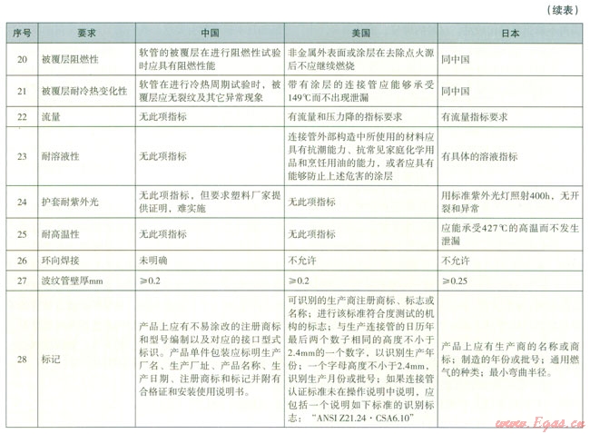 (6)對耐溶液性我們的標準沒有明確要求,美國和日本標準都有要求,我們需要根據(jù)我國的實際制定相關的要求,包括耐紫外光,建議在以后標準修訂時,能夠參考日本的標準制定適合我國國情的相關要求,如耐溶液性除了常用的油鹽醬酷外,包括清潔用的除油劑和洗滌劑,耐紫外光可以直接采用日本標準的相關部分。因為中國的塑料原材料生產(chǎn)比較混亂,塑料的成分沒有統(tǒng)一的標準,而且檢測它的化學成分難度比較大,尤其足用舊的塑料回用,性能明顯下降,但是很難識別,原材料廠家的檢測報告都是通過標準樣塊送檢,沒有可比性,我們應盡快制定相關的技術指標及試驗方法,針對波紋軟管成品進行檢測。