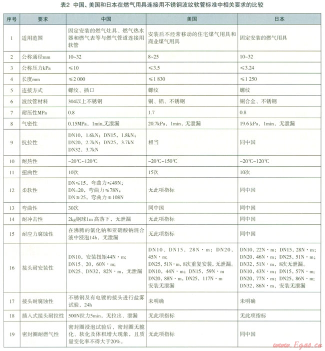 最早的CJ/T l97—2004《燃氣用不銹鋼波紋軟管》標準把燃具用連接軟管和輸送管道用軟管放在了一起,技術性能要求也基本一致,在后來的實際應用中出現(xiàn)了問題:輸送管道用軟管在疲勞試驗方面的彎曲性能要求不需要很高,但是對波紋管管體的強度和使用壽命要求相應更高;而燃具連接用軟管需要柔軟性好,對彎曲和扭曲的疲勞壽命也要求更高。同時,經(jīng)過國內(nèi)廠家的努力,我們的設計水平和制造工藝也大大縮小了和美國、日本的同類產(chǎn)品的差距,而美國和日本對這兩種產(chǎn)品有不同的標準,見表1。在中國市政工程華北設計研究總院相關領導和專家的努力下,按照產(chǎn)品的使用功能把一個標準分成兩個標準,是非常及時和必要的。