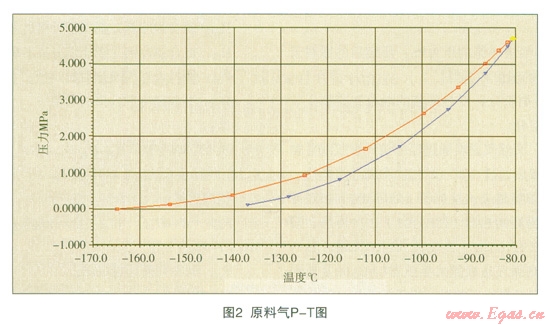 煤層氣液化過程實(shí)際上是一個(gè)氣態(tài)煤層氣等壓降溫成液態(tài)煤層氣的過程。從表1和圖2可以看出煤層氣的露點(diǎn)線和泡點(diǎn)線在壓力達(dá)到某一特定值時(shí)則交于一點(diǎn),即臨界點(diǎn)。從圖3可以看出由于煤層氣是一種混合物,所以與純組分相比露點(diǎn)線與泡點(diǎn)線已不再足完全重合,說明在汽液兩相區(qū)煤層氣的溫度隨汽液比的降低而降低。