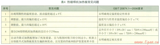 4為常見的熱熔焊機(jī)檢測(cè)中加熱板存在的問題。從表中可看出,一方面,部分焊機(jī)的加熱板存在溫度控制與尺寸不能滿足國(guó)家標(biāo)準(zhǔn)要求的問題。另一方面,由于國(guó)家標(biāo)準(zhǔn)未規(guī)定全自動(dòng)焊機(jī)的銑刀和加熱板安置要求,有些焊機(jī)在焊接作業(yè)過程中可能出現(xiàn)加熱板與銑刀空間過少,產(chǎn)生不可避免的安全隱患。