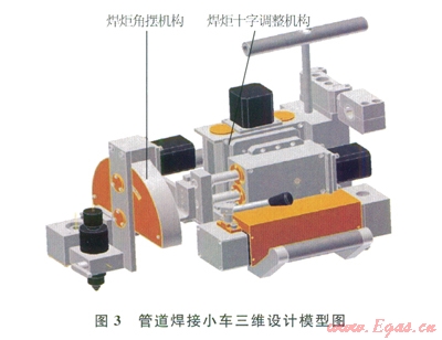 焊接小車主要由焊炬角擺機(jī)構(gòu)與焊炬十字調(diào)整機(jī)構(gòu)構(gòu)成(圖3)。其中,焊炬角擺機(jī)構(gòu)可實(shí)現(xiàn)焊炬最佳的角擺角度和擺動(dòng)頻率,有效避免焊接過程中產(chǎn)生未熔缺陷;焊炬十字調(diào)整機(jī)構(gòu)可實(shí)現(xiàn)焊炬上下位置的調(diào)整與相對(duì)于焊縫寬度的左右位置調(diào)整,以滿足管道焊縫不同位置焊絲與管壁的間距要求及寬度要求。