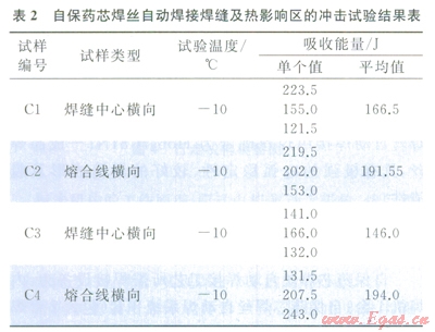 試驗(yàn)證明,白保藥芯焊絲自動(dòng)焊接過程平穩(wěn),焊縫成形好,焊接接頭的抗拉強(qiáng)度、側(cè)彎性能、硬度值、沖擊功等力學(xué)性能均滿足X80管線鋼的焊接標(biāo)準(zhǔn)要求。其焊縫及熱影響區(qū)的沖擊試驗(yàn)結(jié)果見表2。同時(shí),自保藥芯焊絲自動(dòng)焊接可進(jìn)一步降低焊工的勞動(dòng)強(qiáng)度,有效規(guī)避焊接施工中氣體供給帶來的不便,可降低管道焊接綜合成本。