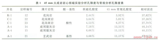6塊巖心核磁實(shí)驗(yàn)孔隙度與常規(guī)分析孔隙度對(duì)比看出,火成巖核磁實(shí)驗(yàn)孔隙度明顯低于常規(guī)分析的孔隙度(1),并且基性巖(21號(hào)巖樣)減小的程度要明顯的大于酸性巖(如表l中的1222、23號(hào)巖樣)。這是因?yàn)椋孕鋷r的磁化率高,孔隙內(nèi)部梯度磁場(chǎng)強(qiáng),核磁信號(hào)衰減幅度大。