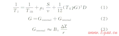 式中T2B為體積弛豫,ms;D為擴(kuò)散系數(shù),cm2s;G為觀測(cè)時(shí)的梯度磁場(chǎng);g為旋磁比;TE為回波間隔;r2為橫向表面弛豫強(qiáng)度;SV為巖石比表面;B0為外加磁場(chǎng)強(qiáng)度;r為磁場(chǎng)變化的距離;Dc為巖石骨架顆粒與孔隙流體之間磁化率的差。