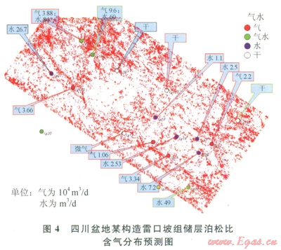 預(yù)測(cè)得到的含氣分布如圖4所示,紅色為含氣。該區(qū)4口純產(chǎn)氣井,3口井位于或緊鄰低泊松比部位(紅色),1口井位于不含氣部位,5口純產(chǎn)水井均位于不含氣的部位,3口氣水同產(chǎn)井都位于或靠近含氣部位,4口干井有2口井位于不含氣部位??傮w看,l6口井3口井不符合(符合率為81%)。