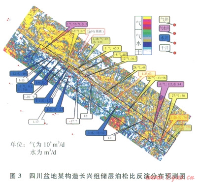 反演得到預(yù)測(cè)區(qū)域目的層泊松比均值分布圖(圖3),紅、黃色代表含氣,綠、藍(lán)色代表含水,灰、白色代表非儲(chǔ)層。圖3中指示框的顏色為含流體類別(氣、氣水、水),其中的數(shù)據(jù)為產(chǎn)量。可以看到,預(yù)測(cè)的氣水分布與試油結(jié)果基本對(duì)應(yīng),效果較明顯,26口井有21口符合,符合率81%。