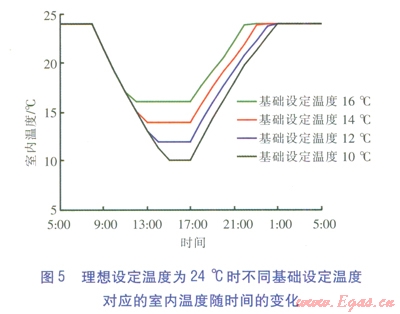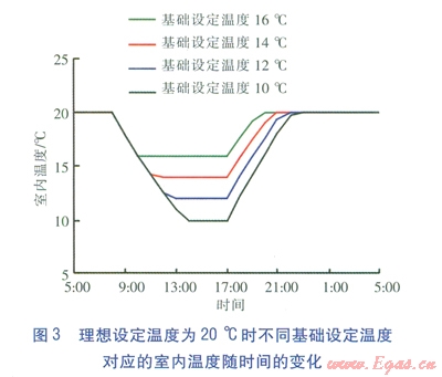 由圖6可知,在理想設(shè)定溫度為20℃、基礎(chǔ)設(shè)定溫度為l4℃條件下,房間3、5在人員外出的時(shí)間內(nèi),室內(nèi)溫度未能降至l4℃。尤其是位于建筑內(nèi)部的房間3,17:00室內(nèi)溫度僅降低至l8℃。對(duì)于這種房間,基礎(chǔ)設(shè)定溫度無(wú)淪是小于還是等于18℃,產(chǎn)生的效果相近。相對(duì)于房間1,房間3、5的室內(nèi)溫度下降時(shí)間較長(zhǎng),溫度回升時(shí)間較短。
