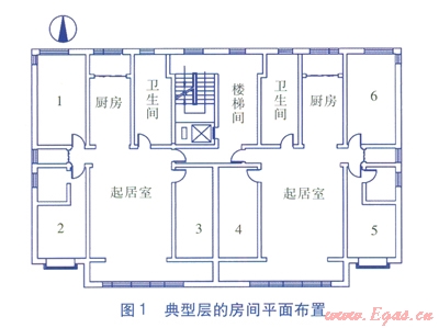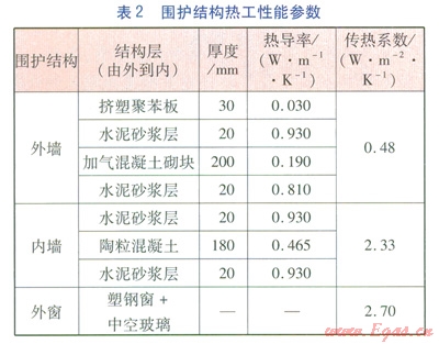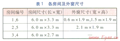 以天津市某住宅小區(qū)建筑為例,該建筑為一梯兩戶(hù)的l5層板樓,層高為3m。典型層的房間平面布置見(jiàn)圖1,東側(cè)住戶(hù)建筑面積為l33.03m2,西側(cè)住戶(hù)建筑面積為132.07m2。各房間及外窗尺寸見(jiàn)表1,圍護(hù)結(jié)構(gòu)熱工性能參數(shù)見(jiàn)表2。