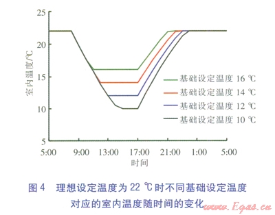 ②在相同理想設(shè)定溫度、基礎(chǔ)設(shè)定溫度條件下,室內(nèi)溫度回升時(shí)間與房間位置、朝向有關(guān)。對(duì)于西北方向有外墻的房間,溫控閥調(diào)高后,室內(nèi)溫度回升至理想沒(méi)定溫度的時(shí)間比其他朝向及建筑內(nèi)部房間長(zhǎng)。因此,對(duì)于臥室位于西北角,或就寢時(shí)間較早的用戶(hù),宜選取較高的基礎(chǔ)設(shè)定溫度。
