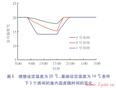 筆者選取東南角臥室(房間5)、無(wú)外墻且與鄰戶(hù)相鄰的臥室(房間3)、西北角臥室(房間l)作為比較對(duì)象。理想設(shè)定溫度為20℃、基礎(chǔ)設(shè)定溫度為14℃條件下,3個(gè)房間的室內(nèi)溫度隨時(shí)間的變化見(jiàn)圖6。