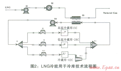 目前,國內(nèi)LNG冷能利用技術(shù)尚在起步階段。全國冷庫的總?cè)萘窟_500多萬噸,基本上都是采用多級電壓縮制冷裝置維持冷庫的低溫,而利用LNG冷能作為冷庫的冷源,則既可以減少壓縮制冷系統(tǒng)的投資,又可以回收LNG的冷能,減少耗電量,節(jié)約能源。