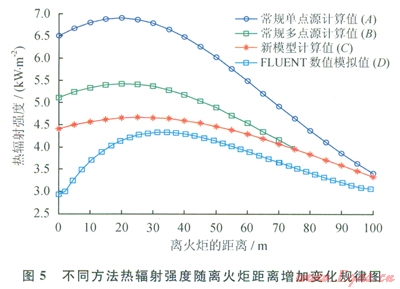 2)將新提出的改進(jìn)模型計(jì)算結(jié)果分別與數(shù)值模擬結(jié)果、設(shè)計(jì)規(guī)范使用的常規(guī)單點(diǎn)源模型計(jì)算結(jié)果以及常規(guī)多點(diǎn)源模型計(jì)算結(jié)果進(jìn)行對(duì)比,驗(yàn)證了新模型計(jì)算出的熱輻射強(qiáng)度有著更高的精度。因此,基于分區(qū)域—多點(diǎn)源模型實(shí)現(xiàn)了在計(jì)算高架火炬射流火焰熱輻射時(shí)的快速簡(jiǎn)便計(jì)算且精度較高,可以克服現(xiàn)有規(guī)范標(biāo)準(zhǔn)中對(duì)熱輻射強(qiáng)度估計(jì)過(guò)高,安全距離劃分過(guò)于保守的不足,為石化企業(yè)高架火炬安全距離的合理劃定、現(xiàn)有高架火炬安全距離設(shè)計(jì)規(guī)范的優(yōu)化與改進(jìn)提供參考。