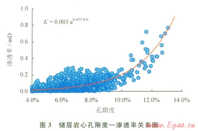 根據(jù)P地區(qū)須二段儲層巖心分析結(jié)果,做出孔隙度—滲透率交會圖(圖3)。分析發(fā)現(xiàn),巖心孔隙度低于6%時,滲透率隨孔隙度增加而變化很小,此時孔隙以無效孔隙為主;巖心孔隙度大于6%時,滲透率隨孔隙度增加也出現(xiàn)明顯增加,此時孔隙是具有一定滲透能力的有效孔隙。因此,以6%作為儲層與非儲層的孔隙度界限值,由孔滲關(guān)系式(式3)計算得出的滲透率為0.038mD。