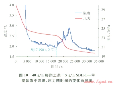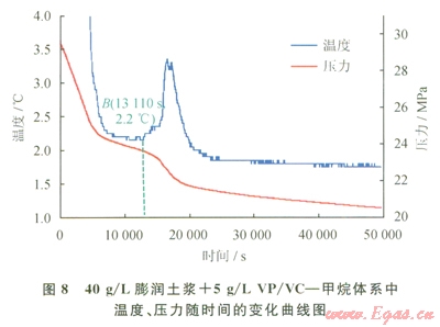 VPVC屬于第二代天然氣水合物動(dòng)力學(xué)抑制劑,由N-乙烯基吡咯烷酮和N-乙烯基己內(nèi)酰胺共聚而成。圖7、8反映了加入VPVC后膨潤(rùn)土漿中水合物的生成過程。