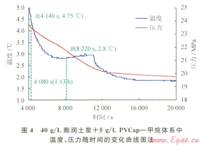 3、4反映了加入PVCap后膨潤(rùn)七漿中水合物的生成過程。圖3中,氣液體系的壓力~溫度曲線在A點(diǎn)處,即l.15h(4140s)時(shí)出現(xiàn)突變.表明體系中初始生成水合物。圖4中,在B點(diǎn)處,即2.28h(8220s)之前,體系溫度與壓力均平緩下降,未出現(xiàn)波動(dòng),表明雖然體系中已經(jīng)初始生成了水合物,但生成的量較小且生長(zhǎng)緩慢。從228 h開始,溫度突然上升,壓力開始大幅下降,表明l.152.28h為水合物生長(zhǎng)階段,在天然氣水合物抑制劑的作用下,水合物以較低的生長(zhǎng)速率緩慢生成。2.28h之后為水合物大量生成階段,此時(shí)抑制劑已失效,高壓釜內(nèi)開始大量生成水合物。與膨潤(rùn)土漿相比,加入PVCap后水合物的成核期僅從1.05h延長(zhǎng)到1.15h,而水合物的生長(zhǎng)期從0.05h延長(zhǎng)到1.13h,表明PVCap對(duì)水合物成核期影響不大,而主要是在水合物生長(zhǎng)期發(fā)揮抑制作用。通過分析,可將PVCap作用下水合物的生成過程分為3個(gè)階段:水合物成核階段、水合物緩慢生長(zhǎng)階段和大量生成階段。這與赫瑞瓦特大學(xué)楊金海[12]。通過超聲波技術(shù)對(duì)相同產(chǎn)品作用下水合物的生成過程進(jìn)行劃分的結(jié)果一致。結(jié)果表明,聚乙烯基己內(nèi)酰胺PVCap主要通過延緩水合物生長(zhǎng)發(fā)揮抑制作用,其分子結(jié)構(gòu)中七元內(nèi)酰胺環(huán)上的氧原子可以與水合物表面形成氫鍵,通過空間位阻作用抑制水合物生長(zhǎng)[22]。