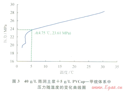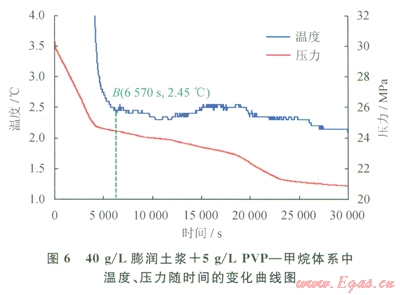 PVP作為第一代天然氣水合物動(dòng)力學(xué)抑制劑的代表,近年來應(yīng)用較多。圖5、6反映了加入PVP后膨潤(rùn)土漿中水合物的生成過程。