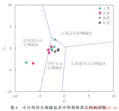 Roser和Korsch[28]曾提出通過沉積巖中Ti、Fe、Mg、Na、K氧化物含量對Al2O3含量比值作為判別函數(shù),來區(qū)分沉積巖碎屑物源區(qū)是鐵鎂質(zhì)、中性、長英質(zhì)火山巖和石英巖4種沉積物源區(qū)(圖6)。判別函數(shù)F1=30.638TiO2/Al2O3-12.54Fe2O3/Al2O3+7.329MgO/Al2O3+12.031Na2O/Al2O3+35.402K2O/A12O3-6.382;判別函數(shù)F2=36.500TiO2/Al2O3-10.879Fe2O3/Al2O2+30.875MgO/Al2O3-5.404Na2O/Al2O3+11.112K2O/Al2O3-3.89[29-30]。從圖6中看出,祁連山凍土區(qū)4類碳酸鹽巖中碎屑大部分為中性火山巖物源區(qū)。其中,第Ⅱ類碳酸鹽巖中的碎屑部分顯示中性火山巖物源區(qū)與鎂鐵質(zhì)火山巖物源區(qū)交界處,更偏于鎂鐵質(zhì)火山巖物源區(qū)。這與前述分析相一致,即該類碳酸鹽巖中黏土類礦物在沉積中貢獻較小,該類碳酸鹽巖中åREE平均含量最低(103.61mg/g),顯示為Eu正異常。