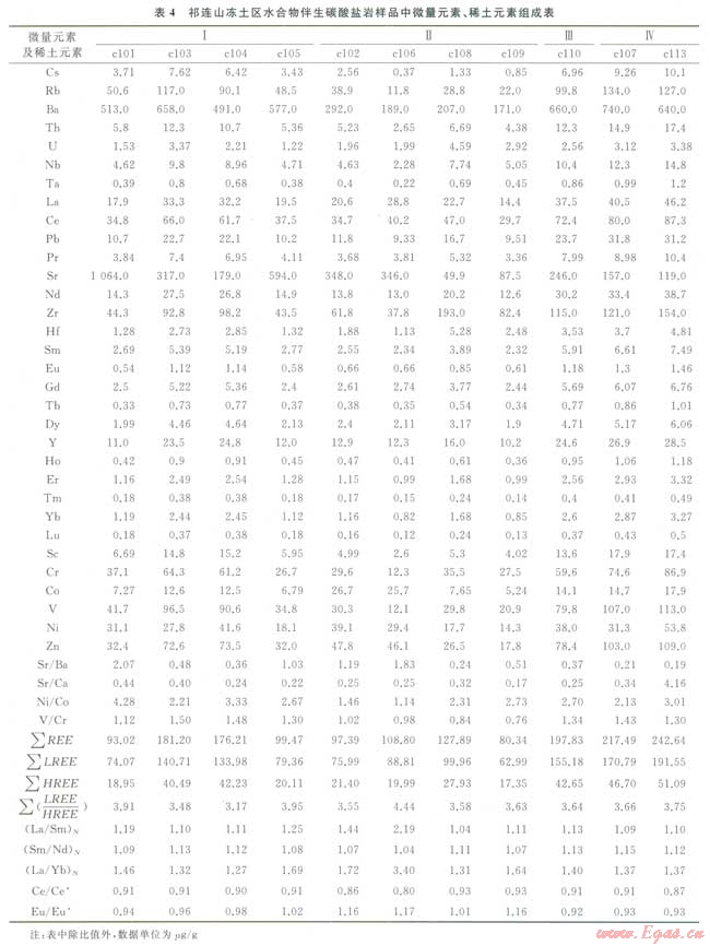 野外鉆探取樣過程中發(fā)現(xiàn)水合物常與碳酸鹽巖伴生,這一現(xiàn)象暗示了水合物可能與碳酸鹽巖之間存在著某種聯(lián)系。海底水合物分布區(qū)中伴生碳酸鹽巖中的碳普遍認為主要來源于水合物分解釋放的甲烷,其次還可能來源于滲漏的甲烷氣體,或深部滲漏的重烴(油)、沉積物中有機質(zhì)等被氧化產(chǎn)物。對祁連山凍土區(qū)伴生碳酸鹽巖中C、O同位素研究表明,第Ⅰ、Ⅲ、Ⅳ類伴生碳酸鹽巖巾碳、氧同位素組成相關(guān),而第Ⅱ類伴生碳酸鹽巖中碳、氧同位素組成相對獨立,第Ⅱ類伴生碳酸鹽巖組成明顯不同于第Ⅰ、Ⅲ、Ⅳ類伴生碳酸鹽巖[31],其伴生碳酸鹽巖礦物如方解石、文石、白云石中13C較大程度虧損指示著甲烷是其碳酸鹽巖的一個主要碳源[32-33]。顯微鏡下觀察發(fā)現(xiàn),第Ⅱ類碳酸鹽巖中產(chǎn)出較多草莓狀黃鐵礦,這些特征表明有微生物參與沉積成巖,這也造成第Ⅱ類碳酸鹽巖元素地球化學特征有別于其他類型碳酸鹽巖。