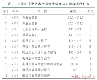 樣品采自青海祁連山木里凍土區(qū)水合物科學試驗鉆探井不同深度巖心,共11件,其均產(chǎn)自水合物產(chǎn)出層段內(nèi)[24],樣品采集深度及地質(zhì)特征見表1。樣品本身為碳酸鹽巖、碳質(zhì)泥巖、泥巖等,其內(nèi)均含碳酸鹽礦物。按地質(zhì)產(chǎn)狀的不同,伴生碳酸鹽礦物在巖層中的賦存狀態(tài)可分成以下4種類型:①白色薄層狀碳酸鹽巖(3~5cm厚),產(chǎn)出在水合物分布層段泥巖中(Ⅰ型,圖2-a);②煙灰色菱形晶簇狀方解石集合體,產(chǎn)出在水合物附近,或呈(云煙狀)微晶方解石(Ⅱ型,圖2-b);③深灰色薄殼狀碳酸鹽巖(小于lmm),產(chǎn)出在水合物層段內(nèi)泥巖微裂隙中(Ⅲ型,圖2-c);④微細浸染狀方解石或微量的碳酸鹽巖,賦存于碳質(zhì)泥巖等中(Ⅳ型,圖2-d)。樣品經(jīng)顯微鏡觀察和X射線粉晶衍射分析,伴生碳酸鹽巖主要由石英、白云石、云母、斜長石、綠泥石、方解石和文石組成,如表2所示。